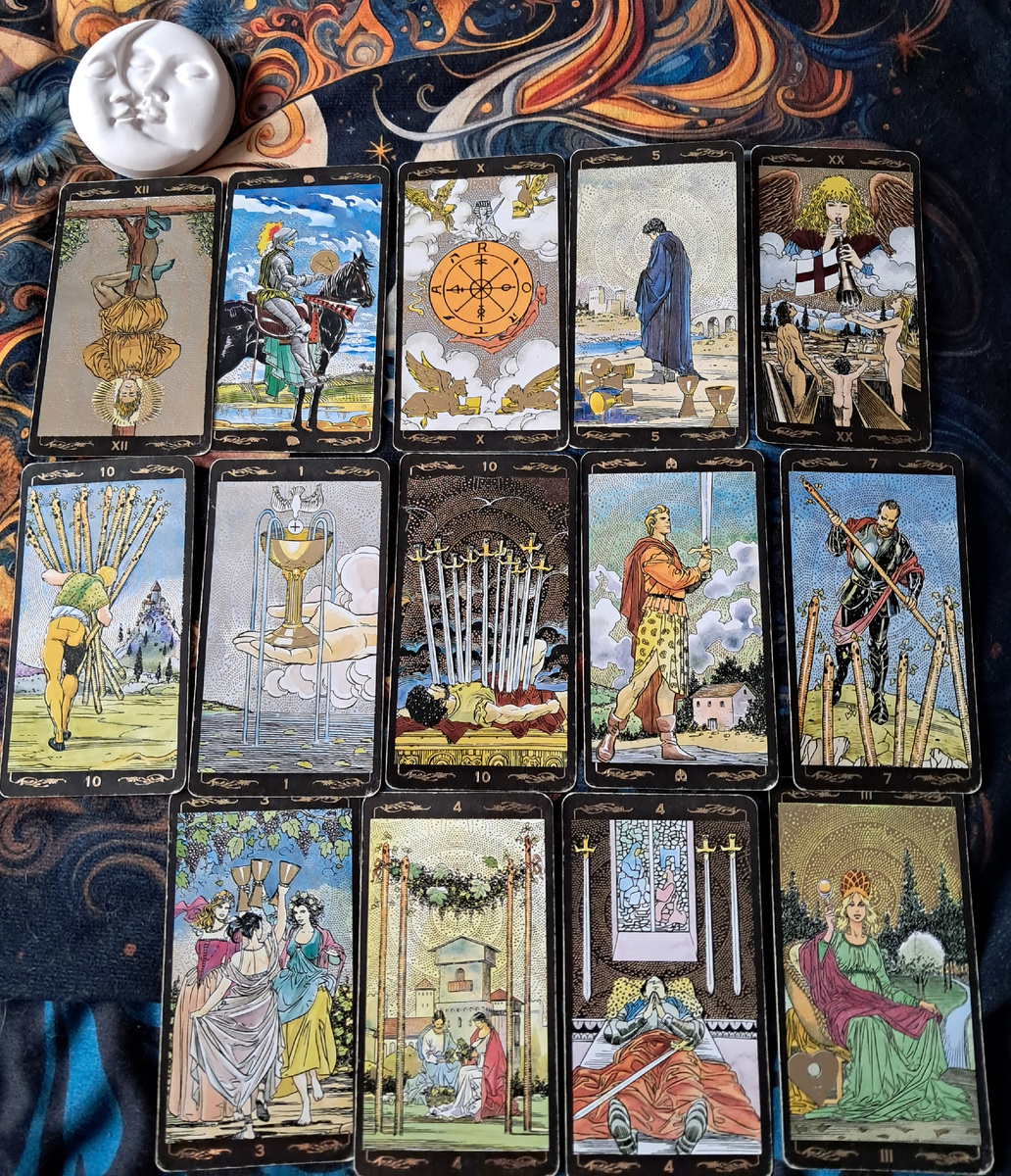 (Повешенный, Рыцарь Пентаклей, Колесо Фортуны, 5 Кубков)