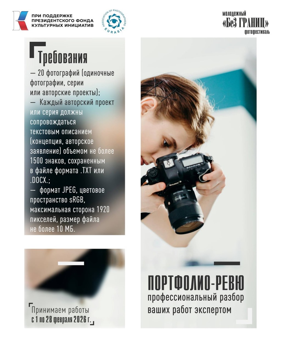 » 💯 📅 Заявка до 28 февраля 2026 г. 👥 К участию приглашаются молодые фотографы 10–22 лет Портфолио представляет собой авторскую коллекцию из 20 фотографий. Работы могут быть представлены в виде одиночных фотографий, серий или авторских проектов. Серия или проект считается за одну работу. Каждый авторский проект или серия должны сопровождаться текстовым описанием (концепция, авторское заявление) объемом не более 1500 знаков, сохраненным в файле формата .TXT или .DOCX. 📸 Технические требования: — формат JPEG, — цветовое пространство sRGB, — максимальная сторона 1920 пикселей, — размер файла — до 10 МБ. Как принять участие? Рассказали в Положении. Проект реализует Ассоциация фотографов «Евразия» при поддержке Президентского фонда культурных инициатив. Под эгидой FIAP. 📎 Подробности на сайте По любым вопросам: eurasia-photo@mail.ru 🤝 Понравился пост? Помоги каналу, подари ⭐️ Написать админу Наши telegram каналы: 1. Фото и видео конкурсы 2. Лучшие фотографии мира 3. Рисунок и