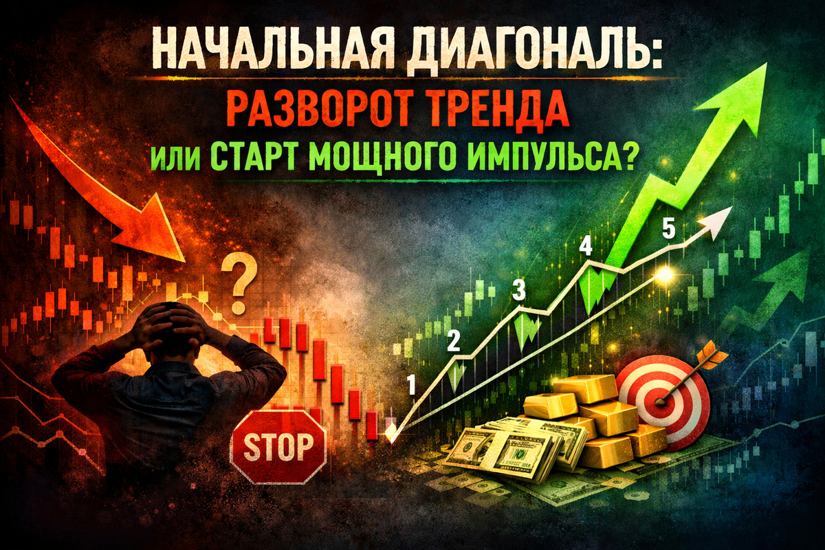 Несколько лет назад я активно торговал клины и диагонали. Казалось, что это почти идеальный паттерн: появляется сужающаяся структура — видный движение скоро закончится. Логично ожидать разворот. Но реальность оказалась сложнее. В одних случаях модель отрабатывала идеально. В других — происходил вынос стопов и только потом разворот. В третьих — цена вообще продолжала движение дальше, как будто никакой диагонали не было. Я начал разбирать свои сделки. Почему так? Почему одна и та же формация иногда «работает», а иногда ломается? Ответ пришёл, когда я начал глубже разбираться в волновом анализе. Диагональ бывает разной Главная ошибка большинства трейдеров — считать любую диагональ сигналом на разворот. На самом деле существует два типа: Конечная диагональ Начальная диагональ И это очень важный разные конструкции. Конечная диагональ формируется в пятой волне импульса или в волне C коррекции. Она действительно часто завершает движение. А вот начальная диагональ — это совсем другая история.