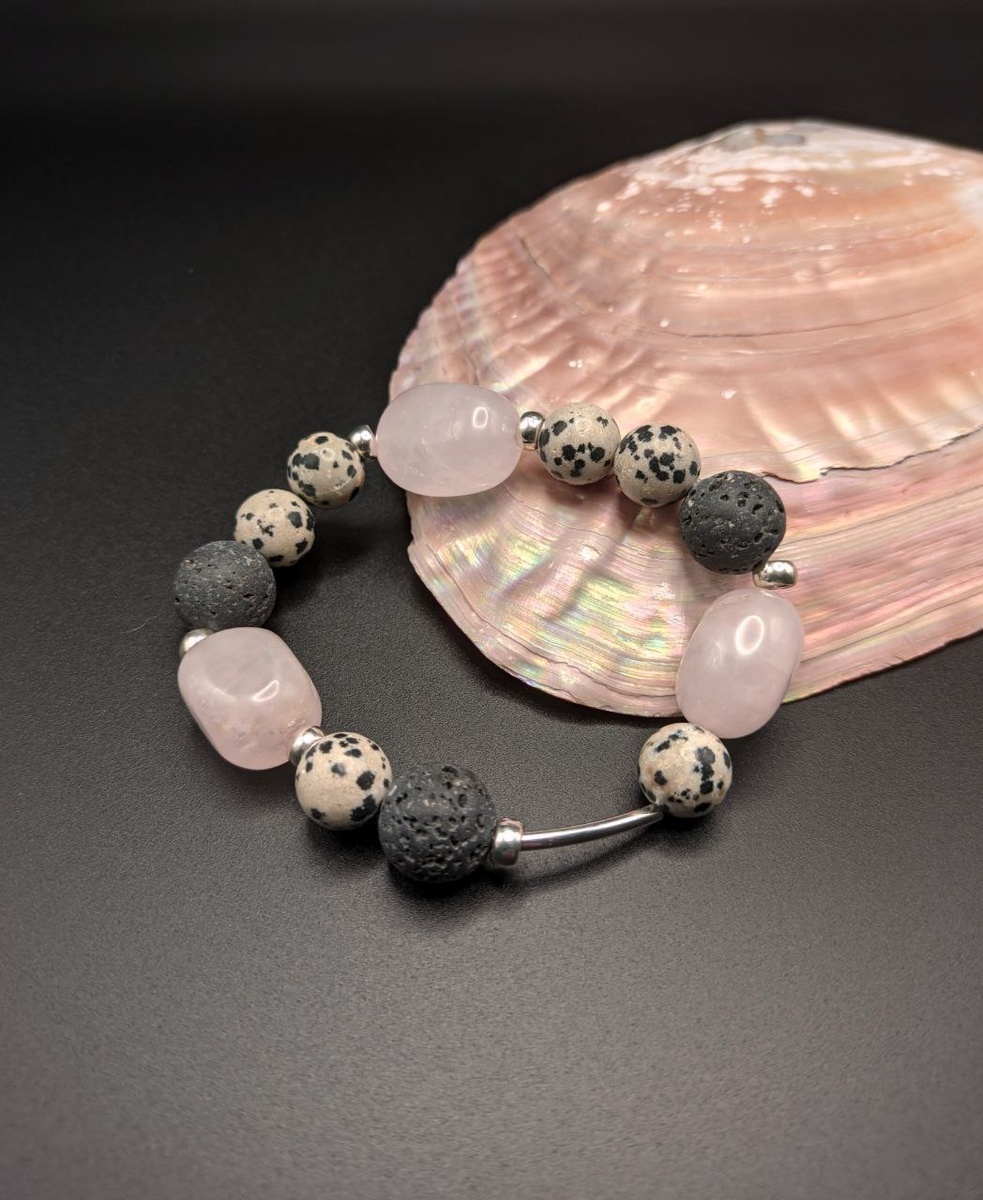 Браслет из натуральных камней розового кварца, серой лавы и яшмы Долматин ✨🙌