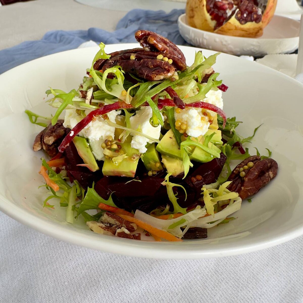 🌲🌲 САЛАТ СО СВЁКЛОЙ И АВОКАДО Полезный,легкий - просто идеальный вариант к завтраку! Удобнее собирать этот салат в кольце, слоями. 1. Отварная свёкла ( порезать тонкой соломкой) 2. Авокадо 3. Творог 4. Микс зеленого салата ( у меня Микс с морковью и свёклой) 5. Орехи Пекан ЗАПРАВКА: Оливковое масло Горчица дижонская зерновая Лимонный сок #бархатныйрецепт #завтрак #салат