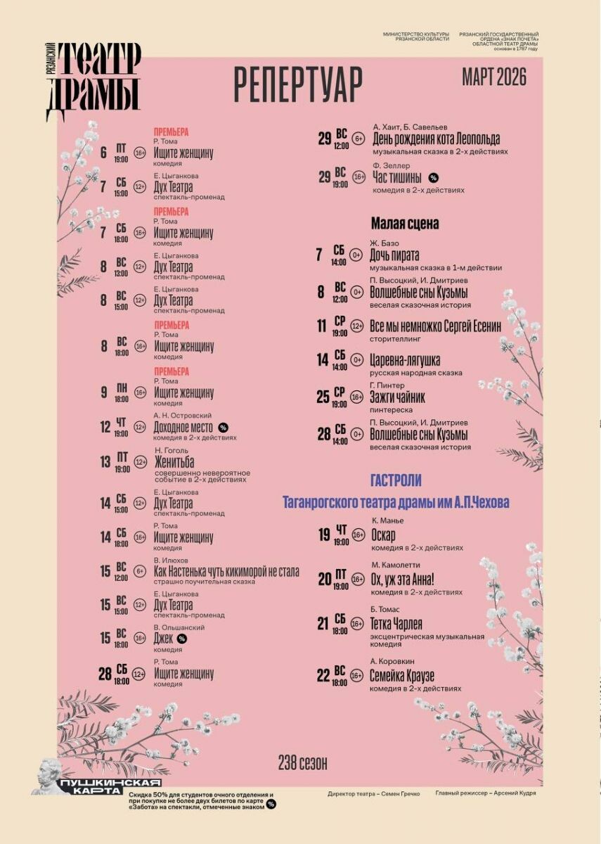 Рязанский драматический театр опубликовал репертуар на февраль 2026 года и сообщил о начале репетиций сразу двух новых спектаклей. Первая премьера — «Ищите женщину» по мотивам пьесы Робера Тома «Попугаиха и цыплёнок» в переводе Светланы Володиной. Над постановкой работает режиссёр-постановщик Максим Ларин, а в главных ролях — заслуженные артисты региона: Юрий Борисов, Сергей Невидин, Марина Мясникова, а также Марианна Гордеева, Марина Невидина-Шульц, Вячеслав Мельник и другие. Премьера запланирована на март 2026 года. Вторая новинка — «История кота-убийцы» по книге Энн Файн «Дневник кота-убийцы». Режиссёром выступает Светлана Кузянина, чья предыдущая работа «Сахарный ребенок» получила признание зрителей. Спектакль обещает быть ярким, музыкальным и неожиданным — особенно для тех, кто знаком с историей задорного кота Таффи. Премьера состоится в апреле 2026 года.