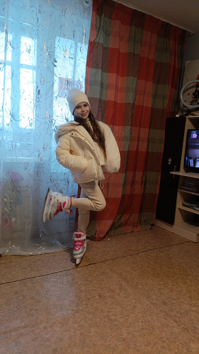 На первой фотографии девочка примеряет уютную белую зимнюю куртку с большой уютной капюшоном, выполненную из материала, напоминающего пуховик. Это отличный выбор для холодной погоды. Белый цвет добавляет свежести, а мягкий и теплый капюшон обеспечит защиту от морозов.