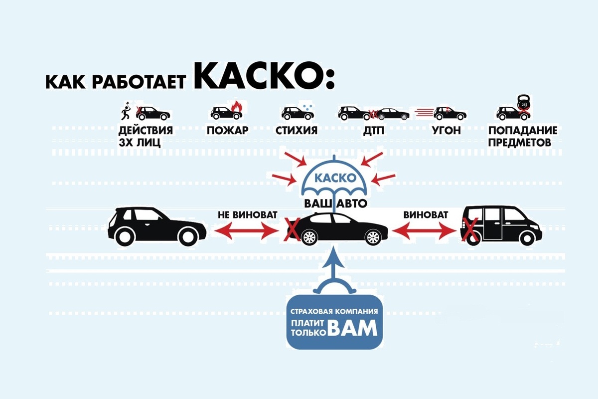 КАСКО (добровольное страхование автомобиля) — защищает сам автомобиль владельца от различных рисков: ДТП (независимо от вины), угона, хищения, стихийных бедствий, пожара, повреждений от упавших предметов и других.