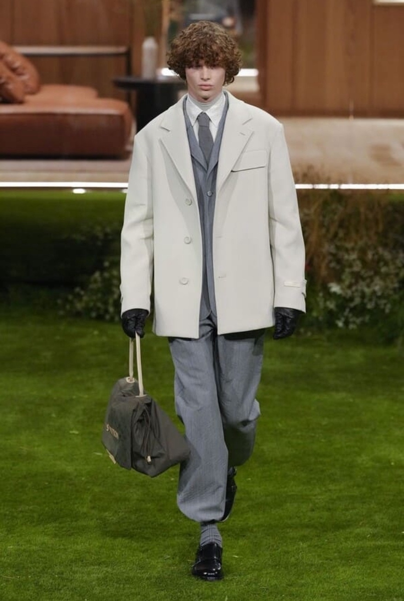 Одним из самых ярких событий стал показ Louis Vuitton под руководством Фаррелла Уильямса. Дизайнер вышел за рамки привычного шоу и поэкспериментировал с архитектурой: в центре сцены в LVMH Foundation возвышался стеклянно-деревянный павильон под названием Drophaus, окружённый японским садом. Модели сначала кружили вокруг этой конструкции, а затем вышли на подиум с новыми версиями культовых дорожных сундуков LV: они были покрыты цветочными витражами в стиле ар-нуво и светились изнутри. Удивила стилизация: на показе были представлены сочетания мужских костюмов и огромных, почти спортивных сумок. Приметной была и игра с принтами: особенно хороша клетка и монограммы, приправленные меховыми элементами. Советуем украсть эти приёмы в свой гардероб. Кроме того, Фаррел Уильямс напомнил и о том, что кожаные перчатки – не только женский аксессуар, но и выгодный акцент в мужском гардеробе.