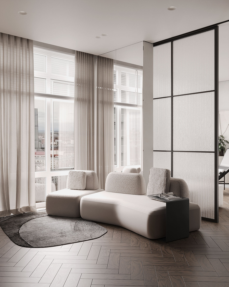 🏠 Обзор проекта. Екатеринбург. Интерьер для семейной пары с расчётом на будущее пополнение семьи. Задача современный минимализм с элементами модернизма: чистые линии, функциональность, тёплая палитра и эстетика через форму и материалы, а не через декор. Основная идея сохранить максимум существующих инженерных решений и создать пространство без транзитных «пустых» зон. 🏗Планировка и логика Рассматривали два сценария: 1️⃣Объединение кухни и жилой комнаты в единое пространство.