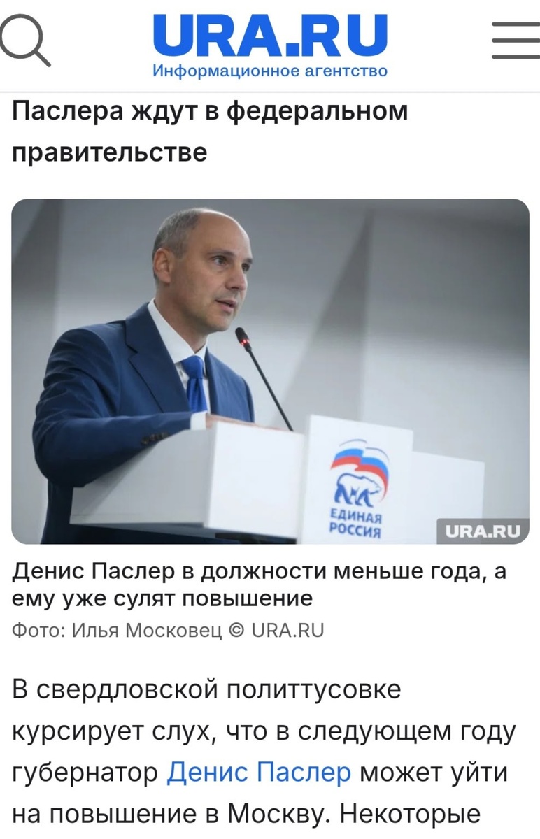 : О политических прогнозах Пятница, 13. На URA. RU, в рубрике "Отборные слухи о лучших людях Большого Урала" появилась информация о том, что Губернатор Свердловской области Денис Паслер в следующем году может уйти на повышение в Москву. Пока на уровне слухов, но, всё может быть! Возможно, что слухи такого рода появились после моего выступления на заседании Экспертного клуба Свердловской области, которое прошло в Екатеринбурге 5 февраля. Цитируя в своём выступлении слова Президента РФ В. В. Путина о том, что ветераны СВО - это элита, которой не страшно передать страну, я предложил руководителю Экспертного клуба, политологу Анатолию Гагарину обсудить на предстоящем Окружном форуме партии "Единая Россия", на котором будет лидер партии "Единая Россия" Д. А. Медведев и Губернатор Свердловской области Денис Паслер, вопрос о выдвижении в ГД РФ 300 участников специальной военной операции. В Законодательное Собрание Свердловской области я предложил выдвинуть не менее 30 у Показать полно