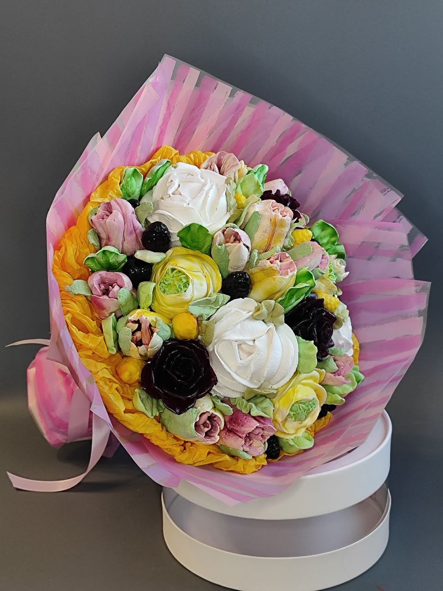 ! Сегодня морозным февральским солнечным утром собрала букет для БФ "Добрый Волшебник" . В составе букета: цветы (розы и тюльпаны) из зефира, мармелада и суфле.