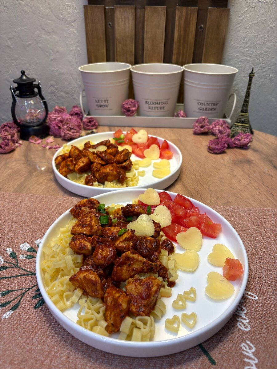 Макароны разложить по тарелкам, сверху выложить кусочки филе с соусом. По желанию посыпать зеленью, добавить овощи. В конце выложить нарезанный сыр. Ваш романтический ужин готов. Приятного аппетита! ❤️🍽