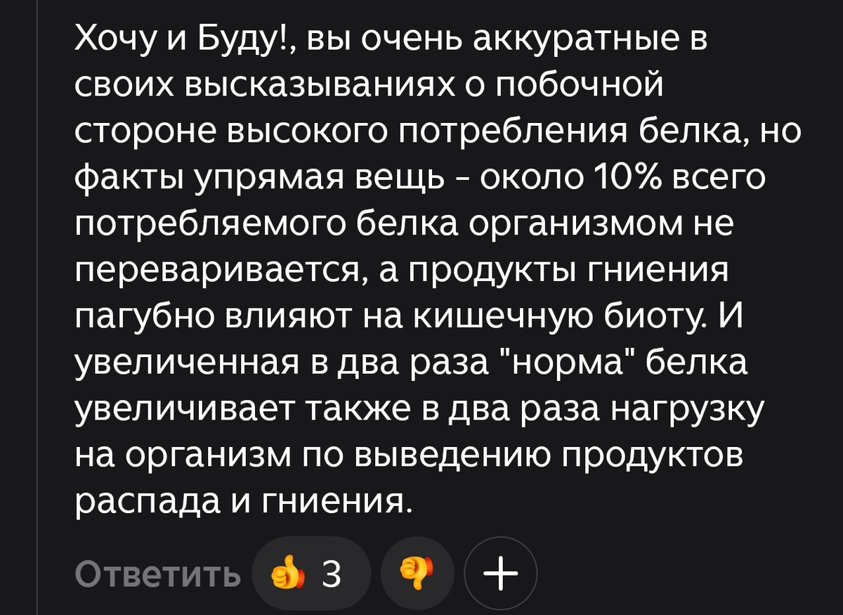Но дело тут не в белке, сам по себе белок не “яд” для микрофлоры, а в крайностях в питании (много мяса, мало овощей, углеводов и другой клетчатки) действительно могут неблагоприятно менять метаболизм бактерий.
