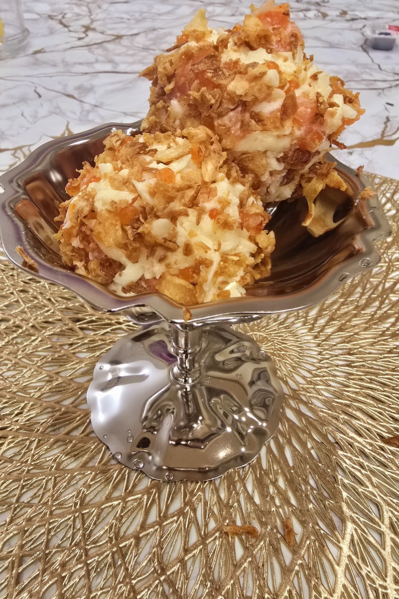 Салат "Царский" от шеф-повара российского бренда "Крошка картошка". Сливочный сыр, солноватые лопающиеся икринки , нежная семга или форель.