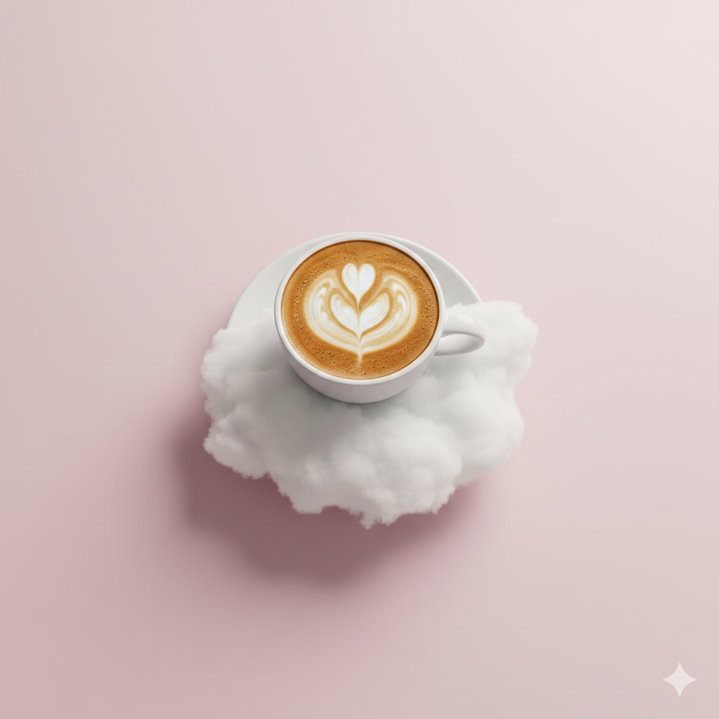 A ceramic coffee cup on a saucer resting on a small fluffy white cloud, soft pastel pink background, dreamlike surrealism, minimalist.
