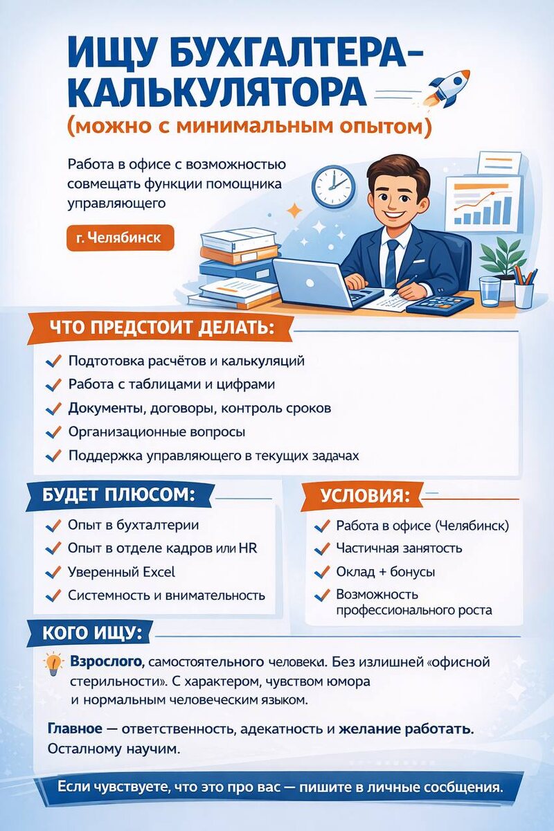 Можно с минимальным опытом — если есть желание расти и работать с цифрами 📊 Работа в офисе с возможностью совмещать функции помощника управляющего. Это не «узкий стол и один участок», а участие в реальных процессах и задачах. Что предстоит делать: — Подготовка расчетов и калькуляций — Работа с таблицами и цифрами — Документы, договоры, контроль сроков — Организационные вопросы — Поддержка управляющего в текущих задачах Будет плюсом: — Опыт в бухгалтерии — Опыт в отделе кадров или HR — Уверенный Excel — Системность и внимательность Условия: — Работа в офисе (Челябинск) — Частичная занятость — Оклад + бонусы — Возможность профессионального роста Кого ищу: Взрослого, самостоятельного человека. Без излишней «офисной стерильности». С характером, с чувством юмора и нормальным человеческим языком. Главное — ответственность, адекватность и желание работать. Остальному научим. Если чувствуете, что это про вас — напишите в личные сообщения. Работать будем по-взрослому. С результатом. 🚀