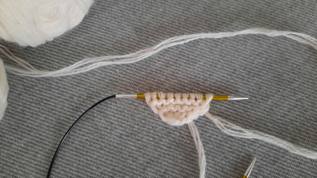 Нам понадобится совсем немного пряжи разного цвета, состава даже толщины. Вязала из пряжи разной толщины в несколько сложений белой, изумрудной и сиреневой.. Пряжа в основном из полушерсти, а так же можно связать из пряжи любого состава. Начинаем вязать с трех петель на спицах № 4 мм. Первый и второй ряд вяжем все лицевыми. Первую кромочную снимаем непровязывая, одна лицевая, последнюю петлю провязываем изнаночной петлей. По изнаночной стороне все лицевые, т.к. следки вяжем платочной вязкой. Со следующего ряда будем делать прибавки с помощью накидов. Кромочную снимаем, накид, 1 лицевая, накид, кромочная изнаночной петлей, а по изнаночной стороне все петли лицевыми, в том числе и накиды, но за заднюю стенку, т.е. скрещенной петлей, чтобы не было дырочек. Так продолжаем вязать... Вязала на спицах № 4 мм. с короткой леской. Прибавляем петли с обеих сторон. Кромочную снимаем, 2 петли вместе, 15 петель, 2 петли вместе, кромочную провязываем изнаночной. Так провязываем и в последнем ряду
