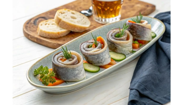 Рольмопсы - это маринованная сельдь, свёрнутая в рулетики с овощной начинкой. Традиционно блюдо распространено в немецкой, латвийской и других европейских кухнях. В качестве начинки можно использовать лук, морковь, корнишоны, яблоко или другие овощи.