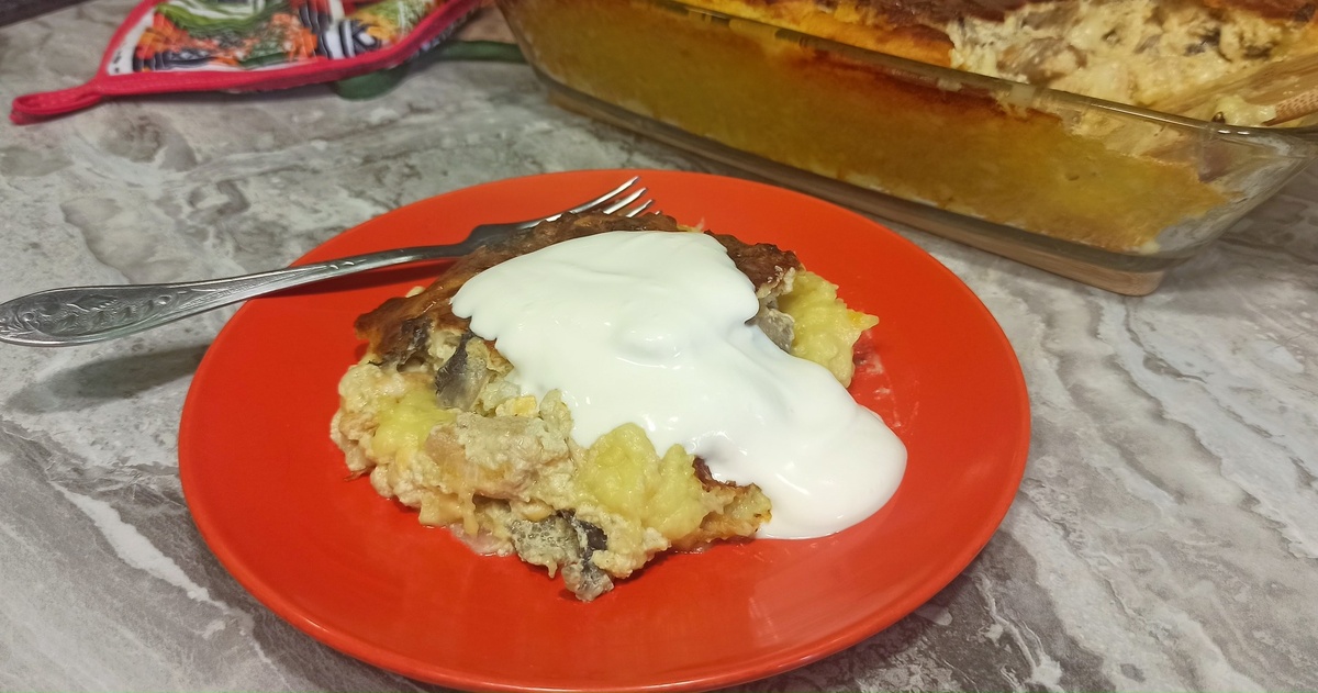 Запеканка из картофеля с курицей и грибами получается невероятно вкусной, нежной и очень домашней. Дети её едят с удовольствием, а взрослым удобно взять кусочек с собой на работу в контейнере — разогрел и полноценный, сытный обед уже готов. Такое блюдо всегда выручает, когда хочется чего-то простого, но по-настоящему уютного. Ингредиенты: Приготовление: Картофель чистим, режем и ставим вариться. При закипании снимаем пенку, солим и доводим до готовности. В это время шампиньоны очищаем, режем слайсами. Лук и чеснок очищаем и режем. На сковороде разогреваем небольшое количество масла, обжариваем лук и чеснок до мягкости, затем добавляем куриное филе, нарезанное небольшими кусочками, и готовим несколько минут. После этого добавляем грибы, солим, перчим и обжариваем всё вместе до готовности. В отдельной ёмкости соединяем яйца, сметану и творожный сыр. Перемешиваем до однородности, затем добавляем твёрдый сыр, натёртый на крупной тёрке или нарезанный небольшими кусочками. Когда грибы с кури