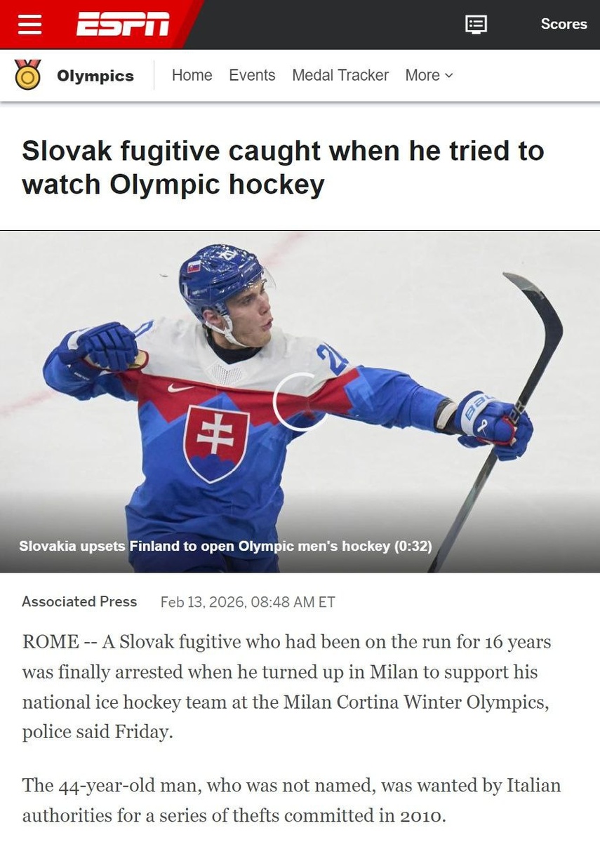 Мужчина прятался от итальянского правосудия в течении 16 лет, но не смог пропустить игру родной хоккейной сборной. Словацкий воришка, совершивший серию краж в 2010-м, решил, что полиция уже выпила за его здоровье, и рванул в Милан поболеть за своих на Олимпиаде. Прямо в отеле перед матчем Словакия — Финляндия его тепло встретили и оформили транзит в тюрьму вместо стадиона. Ирония судьбы: словаки без своего главного болельщика все равно вынесли финнов 4:1. Подпишись на "Новый Взгляд"
