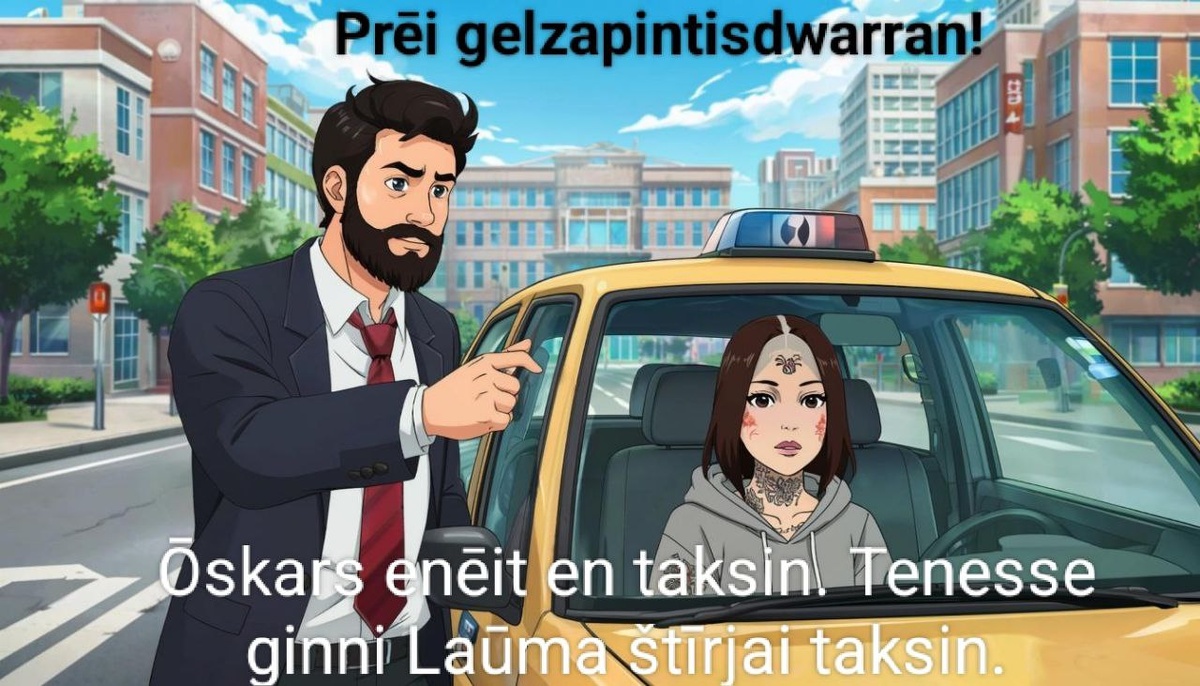 #prūsiskai_kōmiksai@prusiska_bila Prēi gelzapintisdwarran! Ōskars enēit en taksin. Tenesse ginni Laūma štīrjai taksin. — Laūma? Štīrjai tū taksin? — Jā! Sta ast majjan nawwan dēlan. Kwēi kwaitēi tū jātwei? — Prēi gelzapintisdwarran, madli! — Be kwēi ast gelzāpintisdwars? — As ni waīda... — Labbai... Laūma pagaūnja štīritun. — Mes asmai stwi! — Laūma... sta ni ast gelzāpintisdwars. Sta ast uniwersitāti. — Ō... Laūma pagaūnja štīritun. — Mes asmai stwi! — Laūma... — Jā? — Sta ast spitlan... — Ō... Laūma pagaūnja štīritun... etkūmps. — Labbai, mes asmai stwi! — Laūma, sta ni ast gelzāpintisdwars. — As waīda. Sta ast majā appartemēnti. As ni kwaitēi štīritun taksin. Sta ast pawārgewingiskan dēlan. Laūma izēit iz taksin. — Labban naktin, Ōskare! На вокзал! Оскарс садится в такси. За рулём такси его подруга Лаума. — Ты водишь такси? — Да, это моя новая работа. Куда ты хочешь поехать? — На вокзал, пожалуйста! — А где находится вокзал? — Я не знаю... — Хорошо... ⬇️⬇️⬇️⬇️⬇️