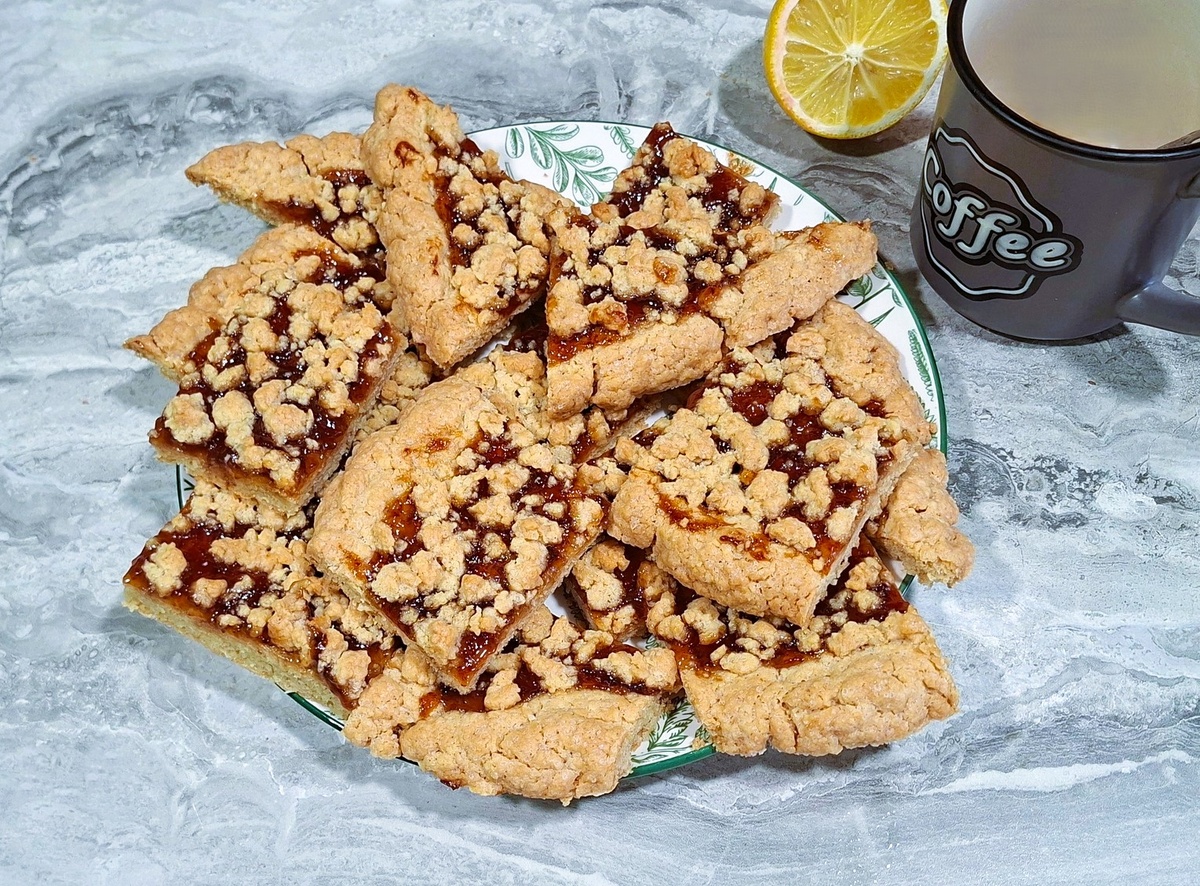 Этот пирог с вареньем — один из самых любимых в семье. Когда была маленькая, его часто готовил папа, и запах выпечки наполнял весь дом. Сейчас готовим его уже детям, и каждый раз это не просто десерт, а маленькое продолжение семейной истории. Он получается рассыпчатым, ароматным, идеально подходит к чаю и готовится из самых простых продуктов. Ингредиенты: Муку просеиваем. Добавляем сахар, соль, соду и корицу, перемешиваем. Сливочное масло растапливаем и вливаем в мучную смесь. Хорошо перемешиваем. Добавляем яйцо и вымешиваем тесто. Оно получается рассыпчатым, крошащимся — это нормально. Важно, чтобы тесто не было слишком сухим, но и не становилось влажным и липким. Делим тесто на две части. Большую часть руками распределяем по форме, формируя пласт. Скалкой пользоваться не очень удобно, лучше делать это ладонями, аккуратно соединяя трещинки по краям. Толщина слоя — около 1 см. Можно немного тоньше, но слишком тонкий слой может стать твёрдым и хрустящим. По краям формируем небольшие бор