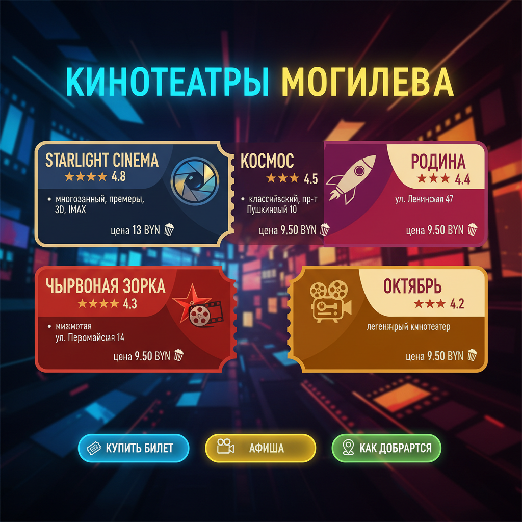 "Starlight Cinema — это лучший кинотеатр в Могилеве! Залы современные, кресла удобные, звук отличный, экран большой. Смотрел "Аватара" в 3D IMAX — просто бомба! Цена выше чем в "Космосе", но качество того стоит. Рейтинг 4.8 — справедливо!" [ref:1]