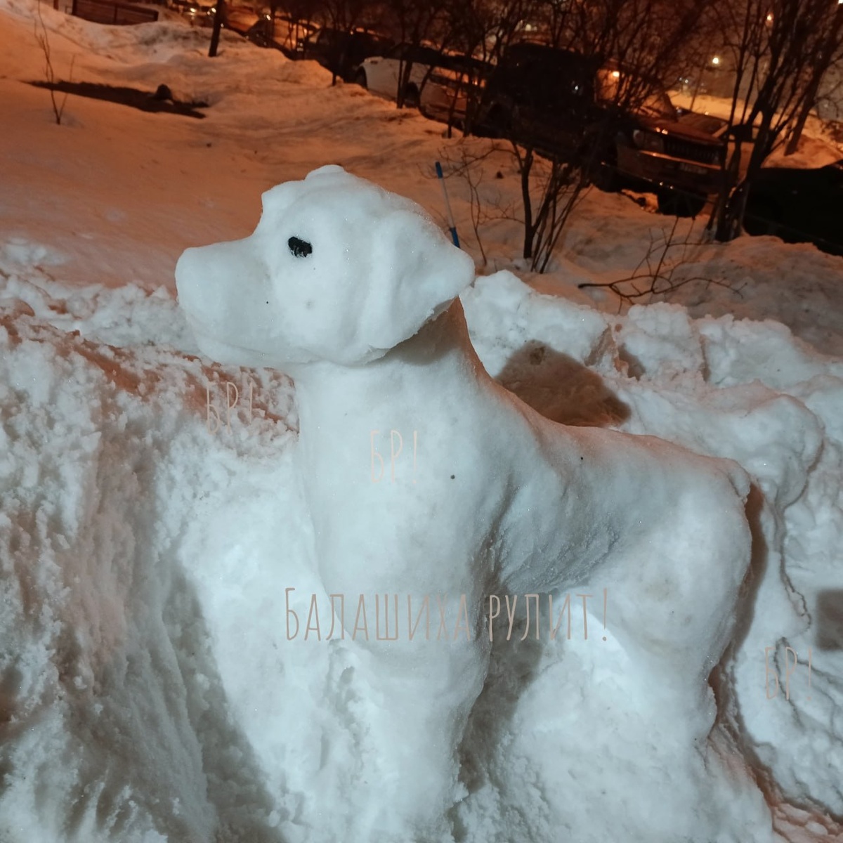 Снежный пес охраняет подъезд на улице Майкла Лунна