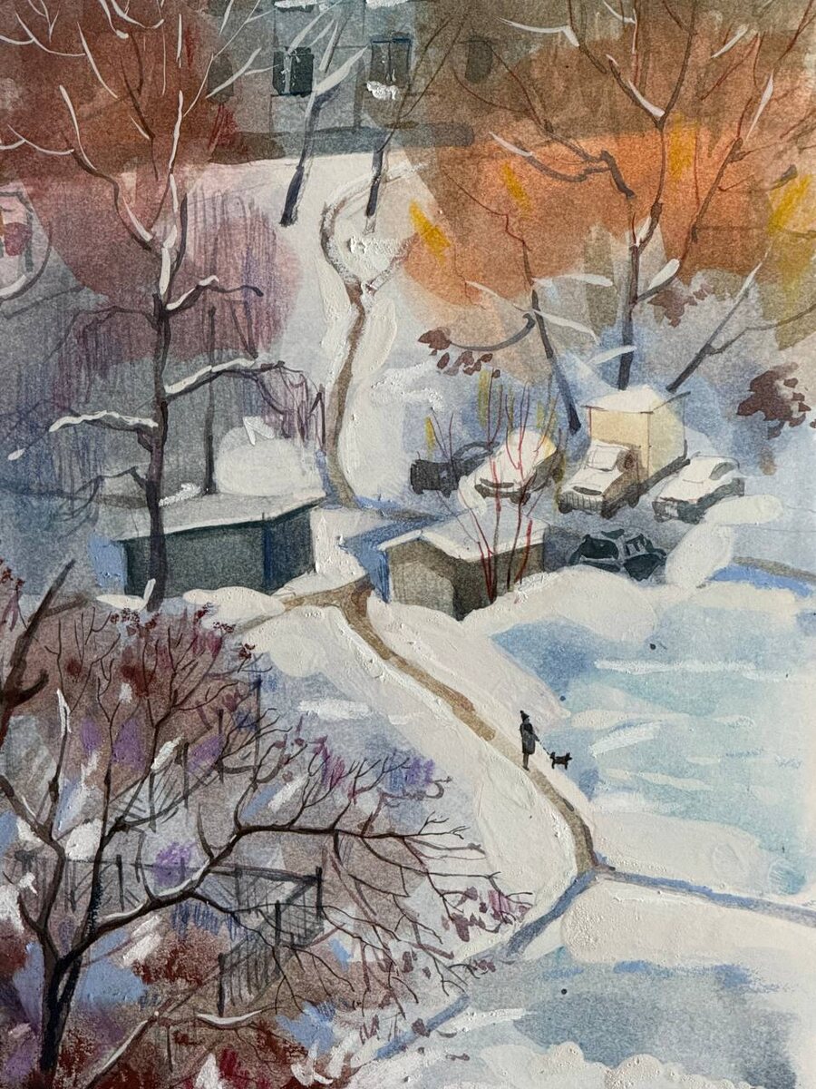 : акварель + гуашь + восковые карандаши Зима в городе — такой сюжет требует глубины и фактуры. Поэтому в данном случае я выбираю смешанную технику. Делюсь своим процессом: 1 этап — акварель. Основа и воздух. Я начинаю с прозрачных заливок. Акварель задаёт настроение работы: холод неба, туманность воздуха, мягкость снега. На этом этапе важно не перегрузить лист — оставить свет, дать краске «дышать». Это самый деликатный и атмосферный слой. 2 этап — гуашь. Плотность и форма. Когда акварель высохла, я добавляю гуашь. Это уже покрывной материал — им я уточняю архитектуру, силуэты домов, плотность сугробов. Гуашь помогает собрать композицию и добавить контраст. 3 этап — восковые карандаши. Деталь и ритм. Финальный штрих — восковые карандаши. Ими я подчеркиваю линии, ритм деревьев, фактуру. Они дают живую графику и лёгкую «шероховатость», которая особенно хорошо работает в городской зимней теме. Мне нравится, что в этой технике каждый материал сохраняет свой характер: акварель — воздух, гуаш
