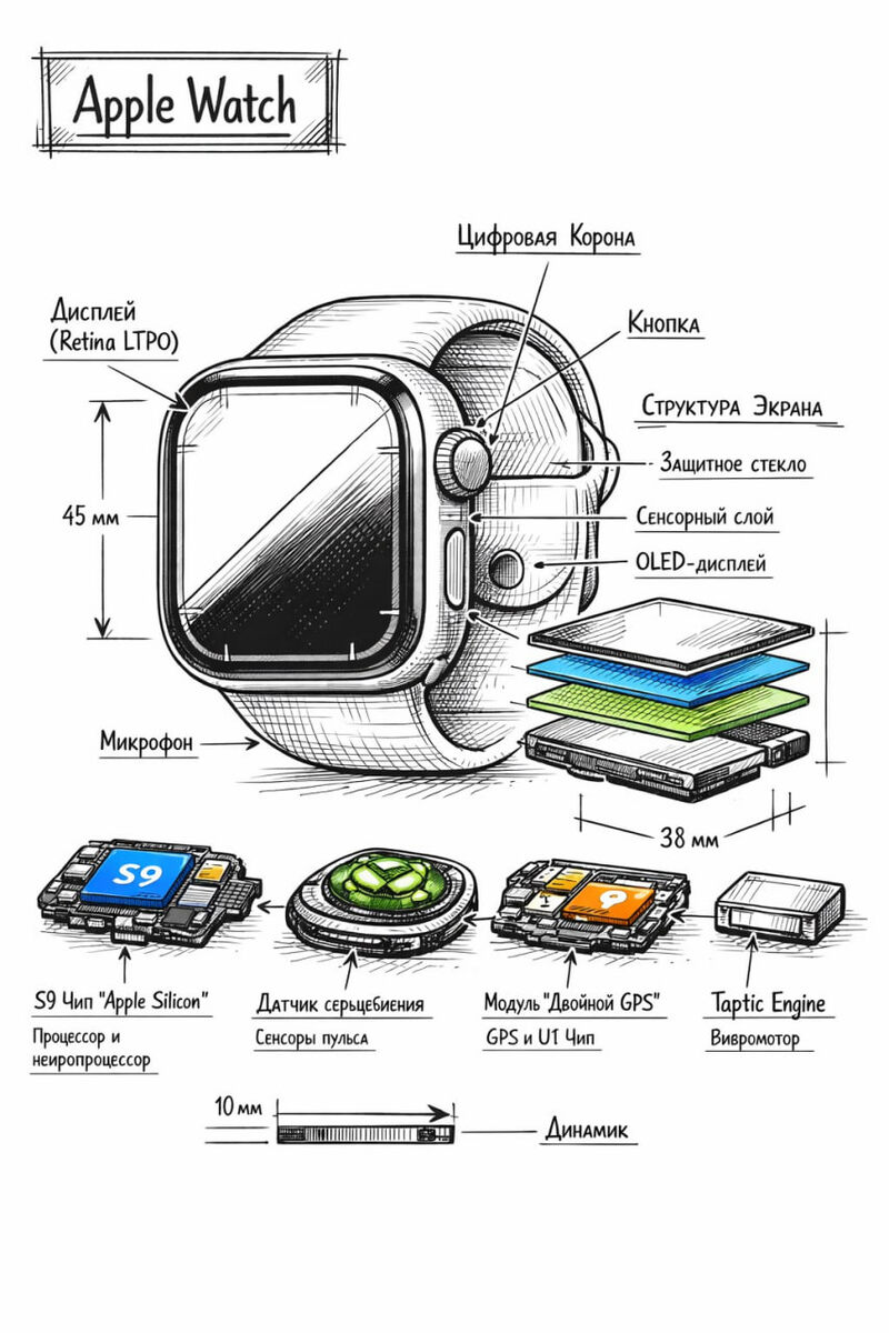 🔥 Разбираем любимую булку на чертежи. Чистый инженерный кайф: фотореализм вперемешку с архитектурными схемами. Идеально для тех, кто любит минимализм, четкость и необычный контент. Закидываем в бот и тестим на любых объектах. ⚡️ Высококачественное инфографическое изображение на русском языке, где фотореалистичный [Apple Watch Series 9] совмещен с техническими аннотациями поверх него. Стиль: [черные чернила, архитектурный цветной эскиз] на [чисто белом студийном фоне]. Добавь: [метки ключевых элементов], [схему внутреннего разреза слоев], [размерные линии и индикаторы масштаба], [состав механизмов с указанием описания и места установки]. Тонкие стрелки указывают на [микросхем и транзисторов]. Заголовок [Apple Watch] вписан в нарисованную от руки техническую рамку в углу. Композиция чистая, сбалансированная, много пустого пространства. Эстетика музейного экспоната или инженерного мануала. Только черный и белый цвета для графики, легкий цветной акцент. Разрешение 1080x1080, ультра-четк