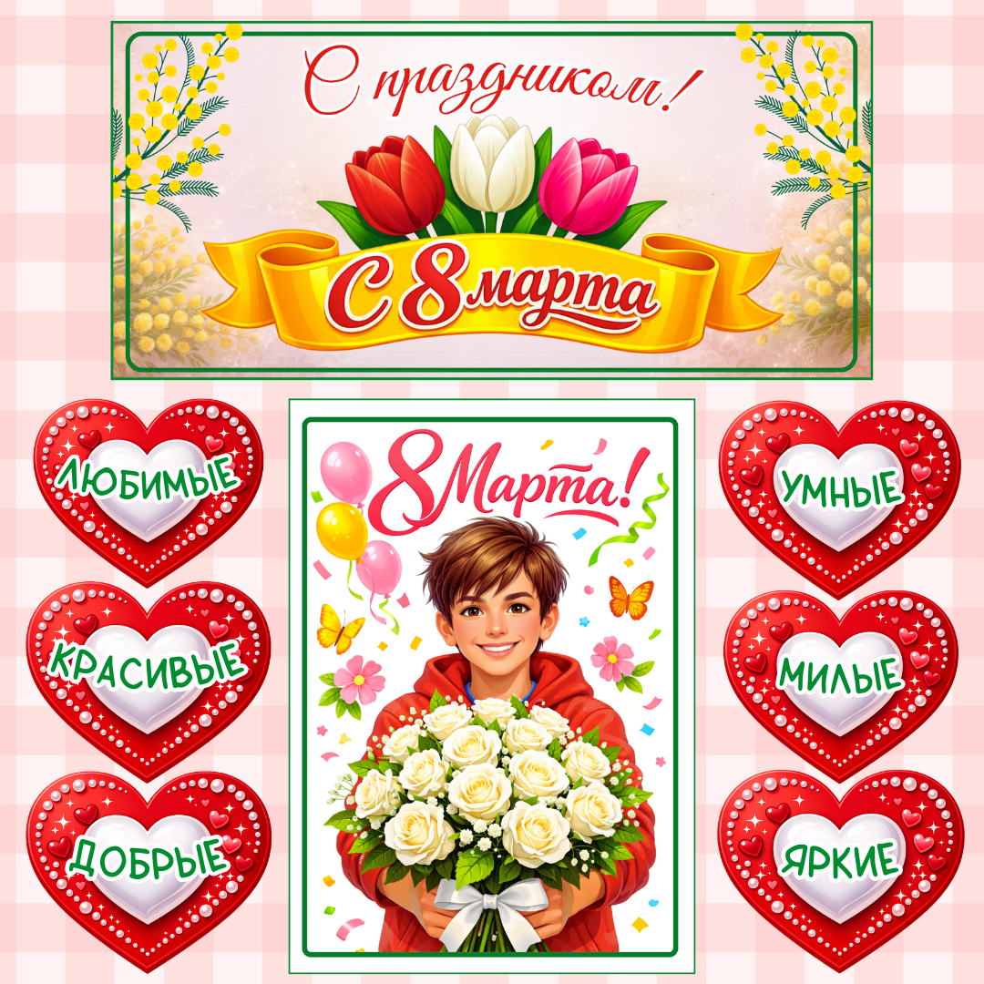 Оформление к 8 Марта для доски, класса, школьного холла или праздничного мероприятия. Центральный баннер с поздравлением «С 8 Марта!» – 3 листа А4.