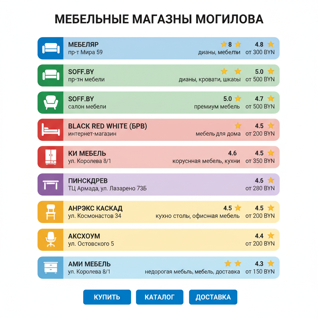 - 💺 Бюджетные магазины — дешевая мебель, простой дизайн (от 150 BYN)