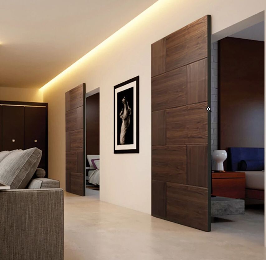 Встраиваемые раздвижные двери — современная альтернатива традиционным распашным конструкциям. Их ключевое преимущество заключается в рациональном использовании пространства: в отличие от распашных дверей, они не требуют свободной зоны для открывания, что особенно актуально для помещений с ограниченной площадью или широкими проёмами. Существует два основных типа раздвижных систем: Основное различие между ними — способ монтажа направляющей: Современные наружные раздвижные системы предлагают широкий выбор решений: Что касается отделки и материалов, раздвижные двери полностью соответствуют стандартам распашных конструкций. Вы можете комбинировать обе системы открывания в одном помещении, сохранив единый стиль интерьера. Например, деревянная или стеклянная дверь с распашным механизмом легко сочетается с раздвижной системой аналогичной отделки.