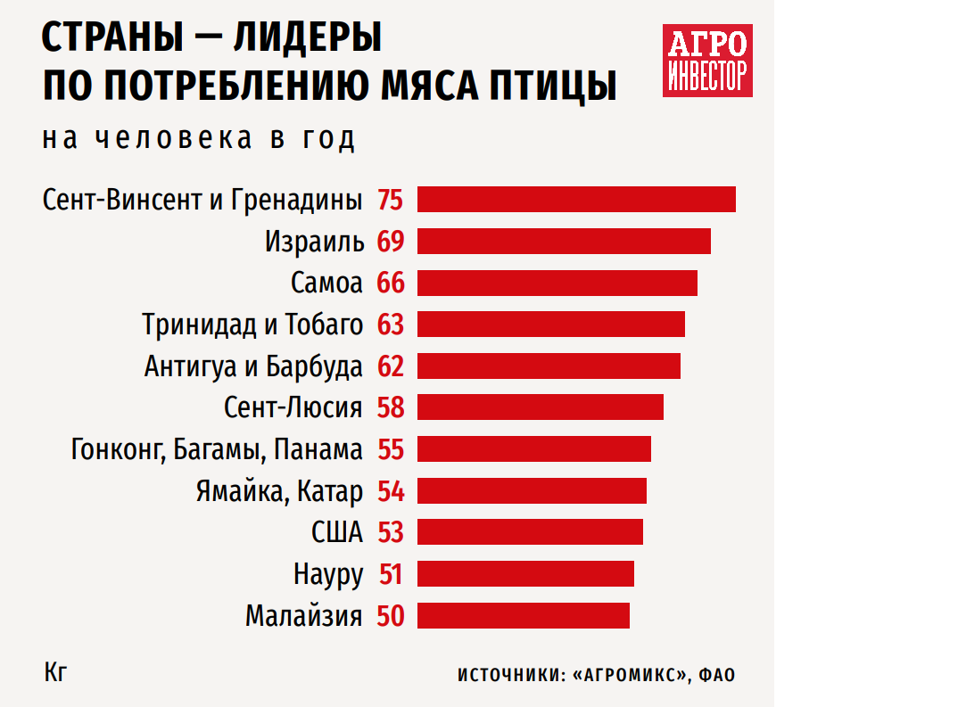 Что касается потребления, то, по данным Национального союза птицеводов, по мясу птицы данный показатель в России стабилизировался на уровне 35-36 кг на человека в год, что соответствует показателям развитых стран, но при этом отстает от многих островных государств с ограниченными земельными ресурсами для выращивания разных видов животных. Потребление яйца превысило 300 шт. на человека, что близко к физиологической норме.