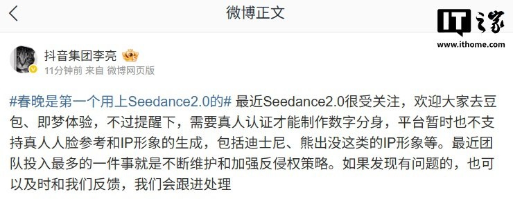 генерацию IP-изображений, включая Disney, Bear Haunt и т. д. IT House сообщил 15 февраля, что сегодня Ли Лян, вице-президент Douyin Group, опубликовал на социальной платформе: «Seedance2.0 в последнее время привлек много внимания. Каждый может попробовать Doubao и Jimeng. Однако напоминаем, что для создания цифрового аватара требуется сертификация реального человека. Платформа в настоящее время не поддерживает ссылку на лицо реального человека и генерацию IP-изображений, включая IP-адреса, такие как Disney и Bears». Имидж и т. д. Одна из вещей, во что команда вложила больше всего средств в последнее время, — это постоянное поддержание и укрепление стратегии борьбы с нарушениями. Если вы обнаружите какие-либо проблемы, вы можете своевременно сообщить о них нам, и мы примем меры и разберемся с ними». Подписывайтесь на t.me/chinese_ai_news и dzen.ru/chinese_ai
