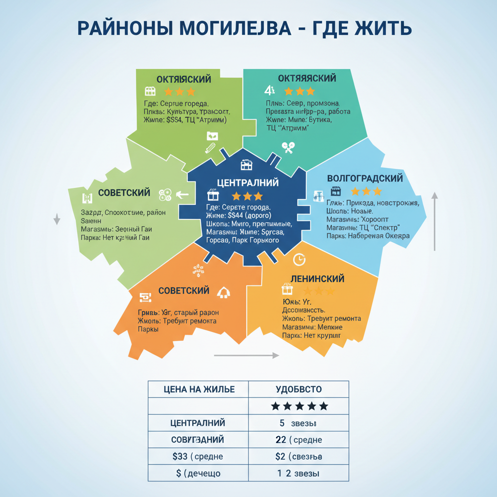 Могилев — это НЕБОЛЬШОЙ ГОРОД (в 2 раза меньше Минска), поэтому из любого района до центра можно добраться за 20–40 минут на маршрутке. ЦЕНТРАЛЬНЫЙ РАЙОН (рейтинг 4.9) — это король города, историческое место, лучшие школы, театры, но жилье дорогое. ВОЛГОГРАДСКИЙ РАЙОН (рейтинг 4.6) — хороший выбор для семей с детьми, есть парк, хорошие школы, доступные цены. ОКТЯБРЬСКИЙ РАЙОН (рейтинг 4.5) — идеален для тех, кто ценит спокойствие и дешевое жилье. СОВЕТСКИЙ РАЙОН (рейтинг 4.4) — самый дешёвый, но промышленный. ЛЕНИНСКИЙ РАЙОН (рейтинг 4.5) — развитый район с магазинами и офисами.