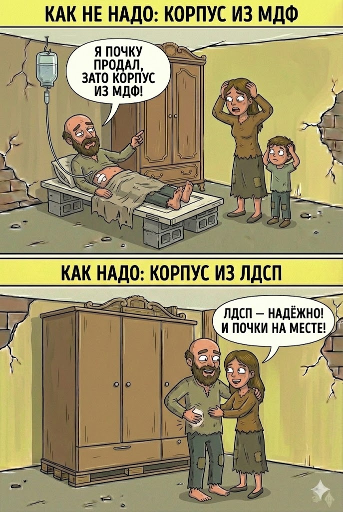Я хотел сделать 20 комиксов на мебельную тему. Вспоминал вопросы которые возникают при заказе шкафов со стороны клиентов и пытался это как то обыграть при помощи ИИ. Я ему задание давал, он рисовал. Прикольно.