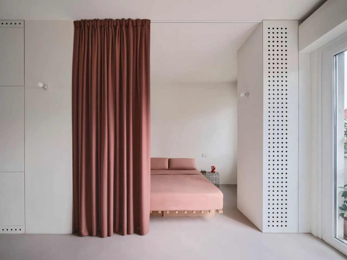 остальное свели к минимуму: блок шкафов слился со стеной, а спальня потеряла свою центральную роль в планировке и превратилась в небольшую, уютную нишу.