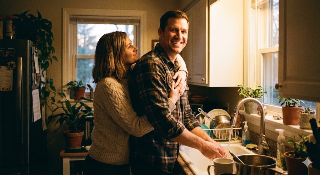 Встала. Подошла. Обняла мужа со спины. Он замер, руки в мыльной пене.