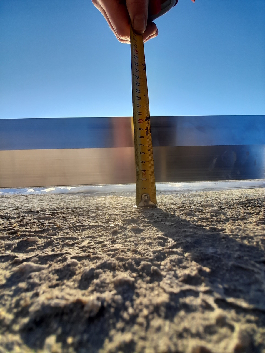 Также поверхность стяжки имела отклонения от прямой линии до 2,5 см. Стяжку подрядчик выполнял уже в начале зимы и, хотя использовал смесь с противоморозными добавками, не ухаживал за ней. Поверхность получилась разнородная по качеству – где-то прочная, а где-то рыхлая, которую можно покрошить линейкой. В ямах поверхность как раз имела рыхлую структуру, низкую прочность. Арматура, которая должна находиться в теле бетона, оказалась на поверхности. Подрядчик предложил накатать в ямах дополнительные слои рулонного материала, игнорируя недостатки качества стяжки. Такое предложение также было отклонено.