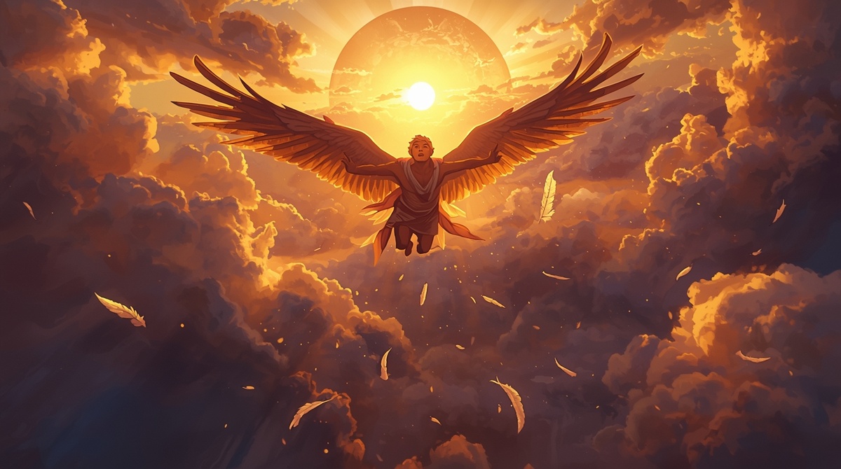 Икар падал. Ветер свистел в ушах. Перья кружились вокруг него, как конфетти. В голове проносилась жизнь: вот он маленький, вот отец учит его строгать дерево, вот мать (которую он почти не помнил) поёт колыбельную, вот первое вино, первый поцелуй, первая драка...