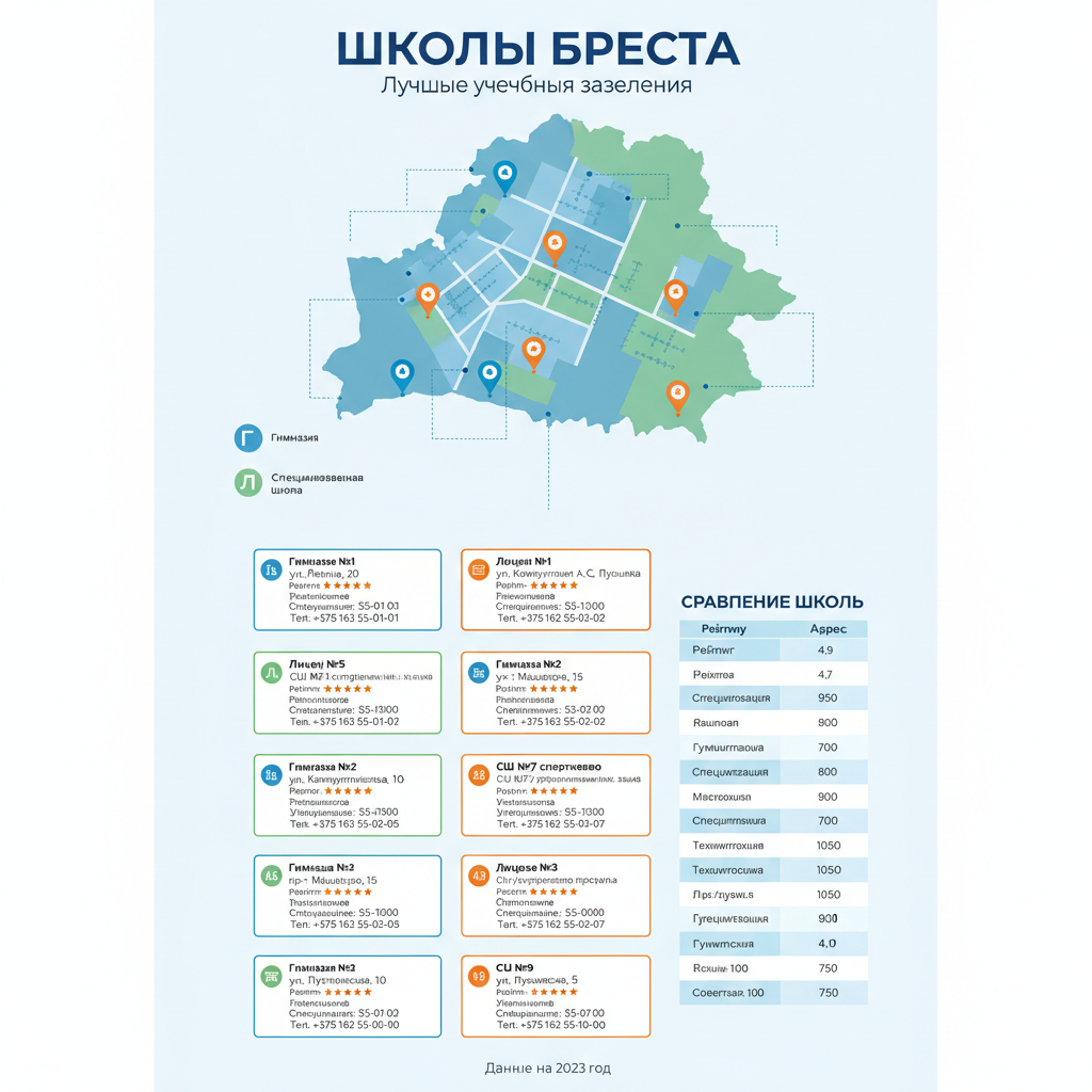 Брест — это ГОРОД С ХОРОШЕЙ СИСТЕМОЙ ОБРАЗОВАНИЯ! [ref:1,2,3] Здесь есть как ПРЕСТИЖНЫЕ ГИМНАЗИИ (Гимназия №1, №2 с рейтингом 5.0), так и ХОРОШИЕ ОБЩЕОБРАЗОВАТЕЛЬНЫЕ ШКОЛЫ (рейтинг 4.3–4.5)! [ref:1,2,3]