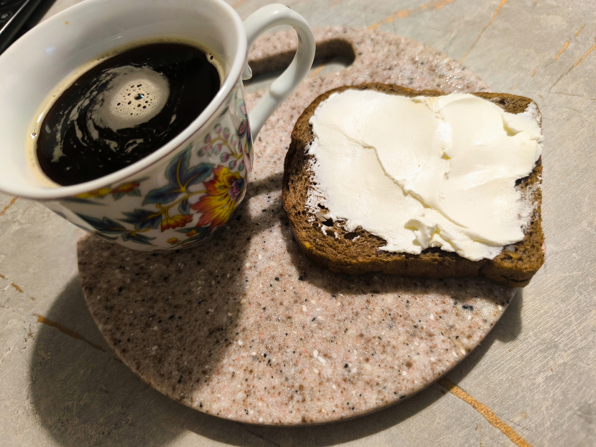 Тут всё как обычно. Кофе растворимый с сахаром , тост с творожным сыром .+коллаген.