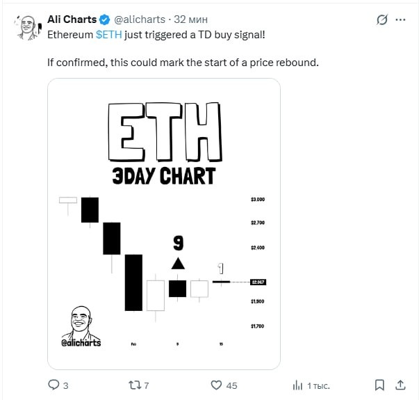 В Ethereum только что сформировался сигнал на покупку по индикатору TD (Тома ДеМарка). Если сигнал подтвердится, это может означать начало восстановления цены
