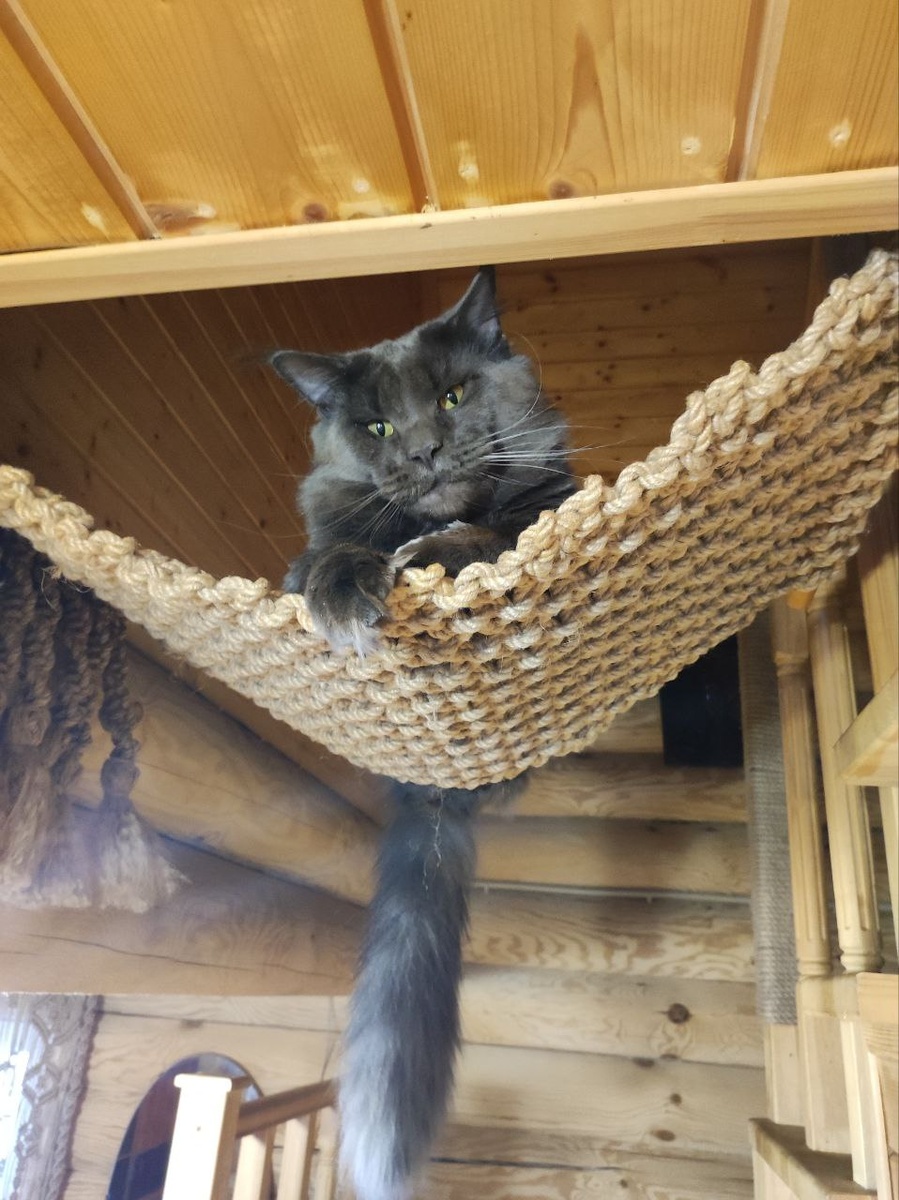 Всем привет! Сегодня хочу поделиться историей о том, как мои хвостатые вдохновители заставили меня вспомнить забытое рукоделие и сплести для них настоящий гамак. С чего всё началось Знаете это чувство, когда твои любимцы смотрят на тебя глазами, полными ожидания? Вот и я не устояла. Наши Мейн Куны — народ требовательный. Магазинные лежанки они тестируют с пристрастием и часто бракуют. То размер не тот, то материал не нравится, то место установки не одобрено высшим кошачьим советом. И тут меня накрыло вдохновение. Руки сами потянулись к мотку верёвки, и я решила: сделаю гамак сама. В технике макраме. С любовью и учётом всех кошачьих пожеланий (которые они мне, по секрету, намурчали). Процесс Должна сказать, плетение макраме — занятие медитативное . Сидишь, завязываешь узелки, а в голове мысли укладываются по полочкам. Где-то на третьем ряду узоров поймала себя на мысли, что уже разговариваю с будущим гамаком: «Ну, держись, сейчас я тебя красивым сделаю, чтобы котики оценили» . Чередовал