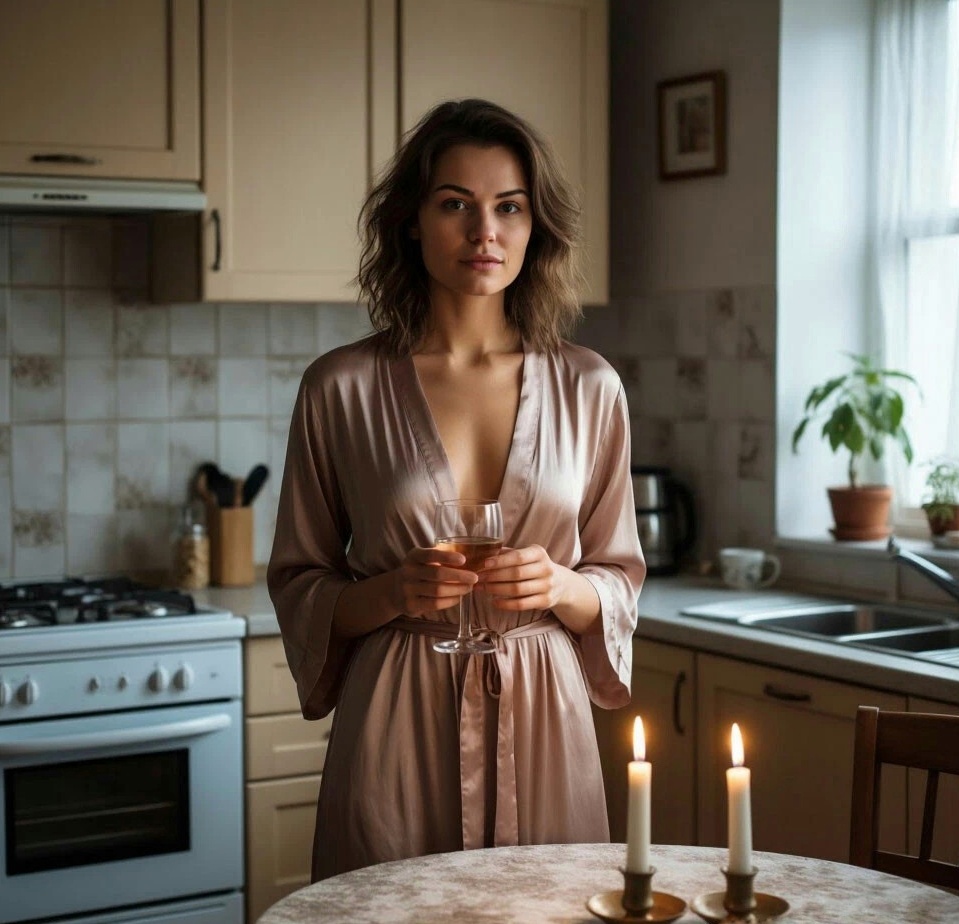 Из кухни выплыла Елена. Она была в шелковом халате, с безупречным макияжем и бокалом вина в руке. На столе горели свечи.