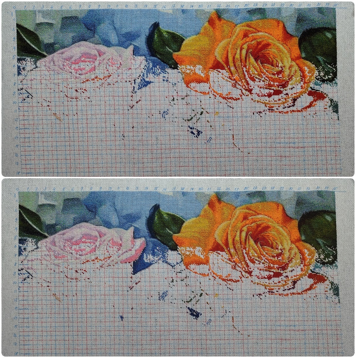 Кто следит за моими продвижениями ежедневно в курсе, что вчера у меня был загруженный денек, и на рукоделие времени осталось гораздо меньше обычного. Но, на удивление, я успела больше, чем думала. Видно напала на меня повышенная шустрость или меньше отвлекалась.. но факт остается фактом! Давайте смотреть. Вышивала я Розы. Думала, что может не стану дошивать привычную норму, остановлюсь раньше. Но как-то оно так хорошо пошло, что я и не заметила, как отшилось 1012//. Немного синего фона и лепесточек бело-розовой розы. Часть стежков белыми и светлыми нитками, их практически не видно на таком этапе. Но зато вполне хорошо видно прогресс в синих и розовых местах. Ну а сегодня будем вышивать.. Пейзаж! И снова небо. Правда, в прошлый раз, я наткнулась на облачко и оно еще не вышито. Так что будет немного разнообразия в море голубого. А теперь заглянем в вязание. Вчерашний вечер был посвящен кофточке с сердечками. И вот тут я прямо удивилась самой себе. После вышивки времени осталось совсем ма