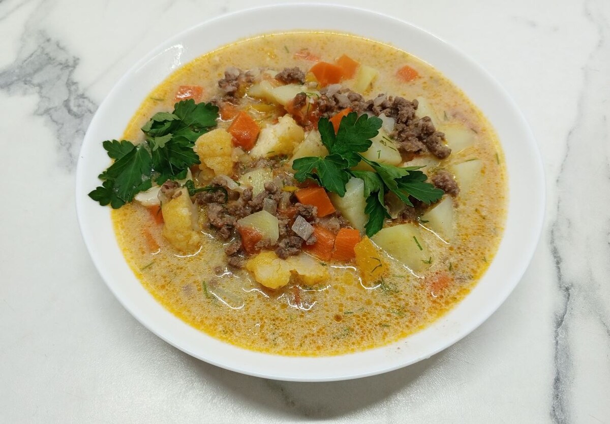 Обычно фарш используется для котлет, пельменей, фарширования перцев, формирования фрикаделек или тефтелей... А вот суп с фаршем... я и сама готовила впервые. Я не имею в виду тот суп, в котором варилось мясо, а потом его измельчали на мясорубке и снова клали в кастрюлю. Нет! Предлагаемый рецепт супа предполагает наличие сырого фарша, овощей, в основном тех, которые всегда присутствуют в нашем холодильнике, и, конечно же, сливок. Я использую сливки 10-ти% жирности, они продаются и не дОрого в каждой Пятерочке, Магните в упаковке тетрапак, и стоЯт в холодильнике даже после вскрытия коробки очень долго. Я готовлю такой суп в кастрюле объемом 5 литров. Очищаю картофель и морковь, режу кубиками: картофель по 1,5-2 см, морковь - по 1 см. Закладываю в кастрюлю и заливаю холодной водой. Довожу до кипения, убавляю огонь и варю под крышкой. Пока варится картофель, обжариваю мелко нарезанный лук на подсолнечном рафинированном масле в течение 5 минут, добавляю фарш и обжариваю его вместе с