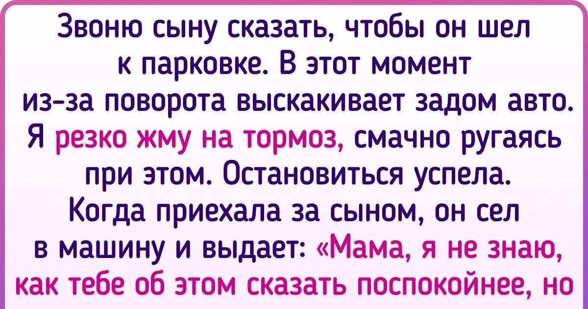 “Звоню сыну сказать, чтобы он шел к парковке. В этот момент из-за поворота выскакивает задом авто. Я резко жму на тормоз, смачно ругаясь при этом. Остановилась. Когда приехала за сыном, он сел в машину и выдает: «Мама, я не знаю, как тебе об этом сказать спокойно, но то, как ты выругалась, слышали мои одноклассники и учительница».”