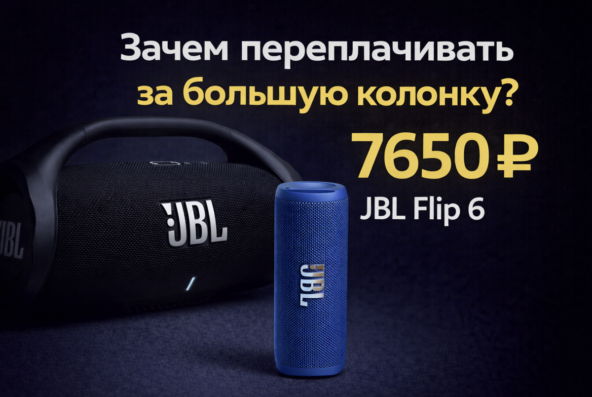 Сейчас — уже нет. JBL Flip 6 — хороший пример, когда размер больше не решает. И сейчас она стоит 7650 ₽ вместо 9540 ₽. Есть ощущение: