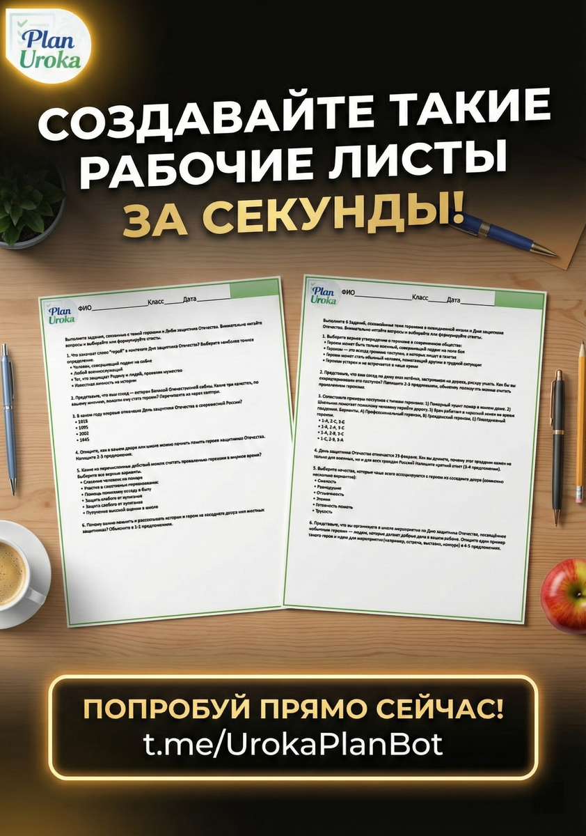 Коллеги, готовимся к «Разговорам о важном» (16 февраля) на тему «Герой из соседнего двора» ко Дню защитника Отечества. Знаем, как это бывает: нужно быстро подготовить рабочие листы для разных классов (с 5 по 11!), чтобы урок был живым и вовлекал всех. Искать, адаптировать, распечатывать... Это время, которого вечно не хватает. Что, если сделать это за 2 минуты? В нашем боте t.me/UrokaPlanBot для учителей вы можете автоматически сгенерировать рабочие листы для этой темы: ✅ Под любую аудиторию: От 5-го до 11-го класса — выбирайте уровень сложности. ✅ Разные механики: Вопросы на размышление, анализ историй, интерактивные задания — чтобы не было скучно. ✅ Готовый ключ: К каждому листу автоматически создаётся лист с ответами и методическими подсказками для вас. Ничего не придётся придумывать. ✅ Экономия времени: Не копируете из интернета — создаёте уникальные материалы под ваш класс. 🎁 Специально для новых пользователей — 3 дня бесплатного доступа ко всем возможностям! Попробуйте прямо сей