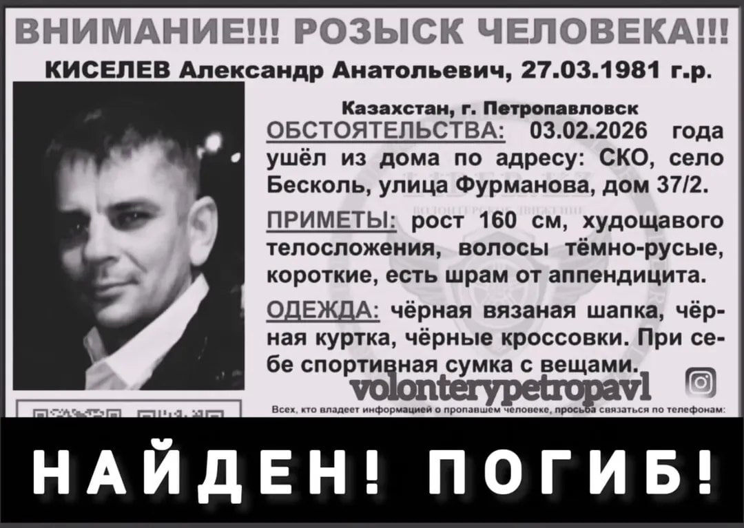 На севере Казахстана почти две недели разыскивали 44-летнего Александра Киселёва. К сожалению, сегодня стало известно, что мужчина погиб, передает Петропавловск.news. Александр пропал 3 февраля в селе Бесколь, с тех пор о нём ничего не было известно до сегодняшнего вечера. В аккаунте группы волонтёров появилось известие, что мужчина погиб. Подробности неизвестны.