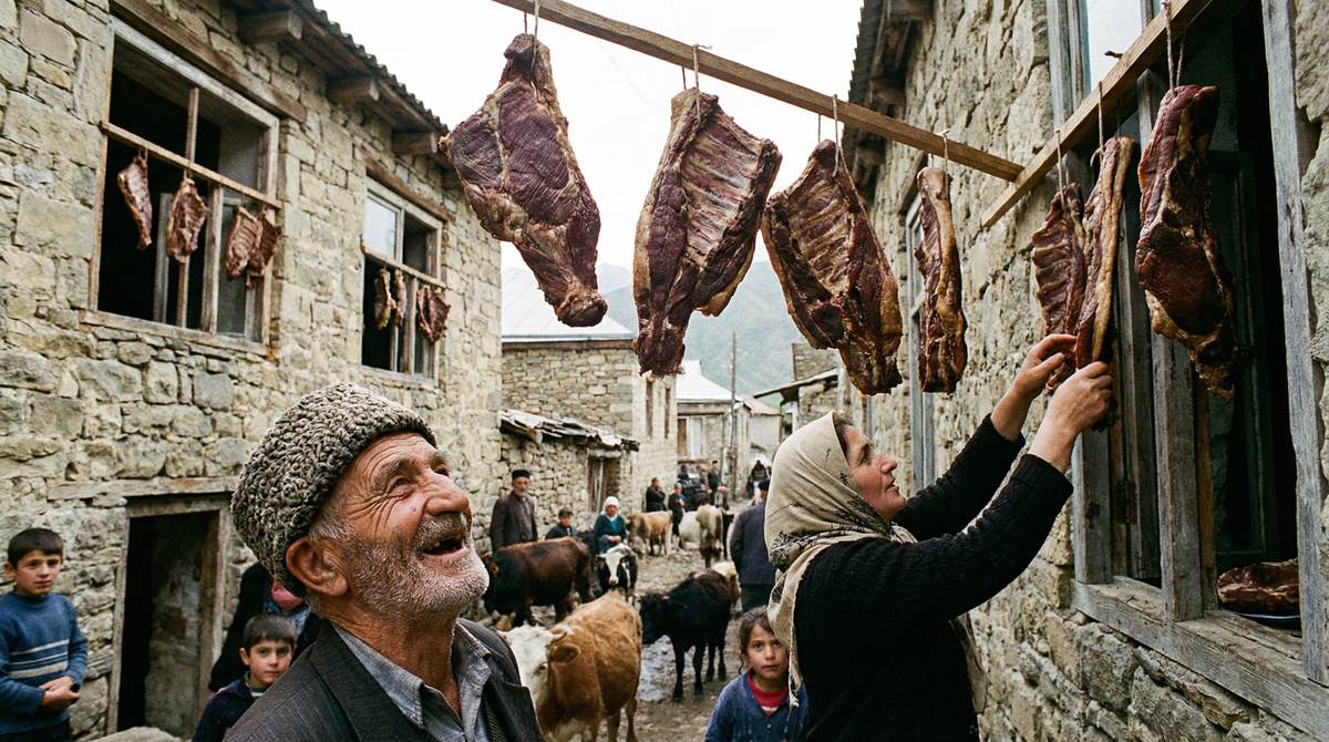 Когда Алексей впервые приехал в горный аул Куруш, он не мог понять, что происходит. Идёт по узкой улочке между каменными домами – и видит: в окнах висит мясо. Не цветочные горшки, не занавески, а куски баранины.